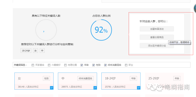 第二个关键点呢,也是今年官方一再重复的CRM,增加老客户的复购。因为这些标签的人群,是最精准匹配你的店铺和产品的人群。如下图所示的可以针对不同标签用户进行营销的功能,不过还未开放。