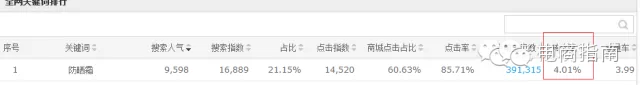 2.成交关键词的高转化率。“防晒霜”高流量低转化,意味着“丸美防晒”的转化率必然高过宝贝平均的6%。也远高于该词行业平均转化。