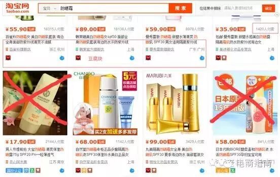 然后我登陆了自己的买家账号,双钻、淘宝V4、天猫T4。千人千面顿时大杀四方,瞬间图中打X的两个产品不见了,首页低于50元的产品仅剩下3款。其中包括这个豆腐块旁边的35.9元的曼秀雷敦防晒霜。
